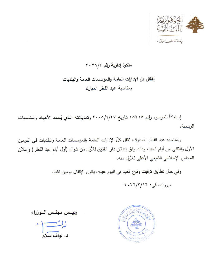 أصدرت رئاسة مجلس الوزراء مذكرتين إداريتين تقضيان بإقفال جميع الإدارات العامة والمؤسسات العامة والبلديات لمناسبة عيد الفطر المبارك وعيد بشارة السيدة مريم.